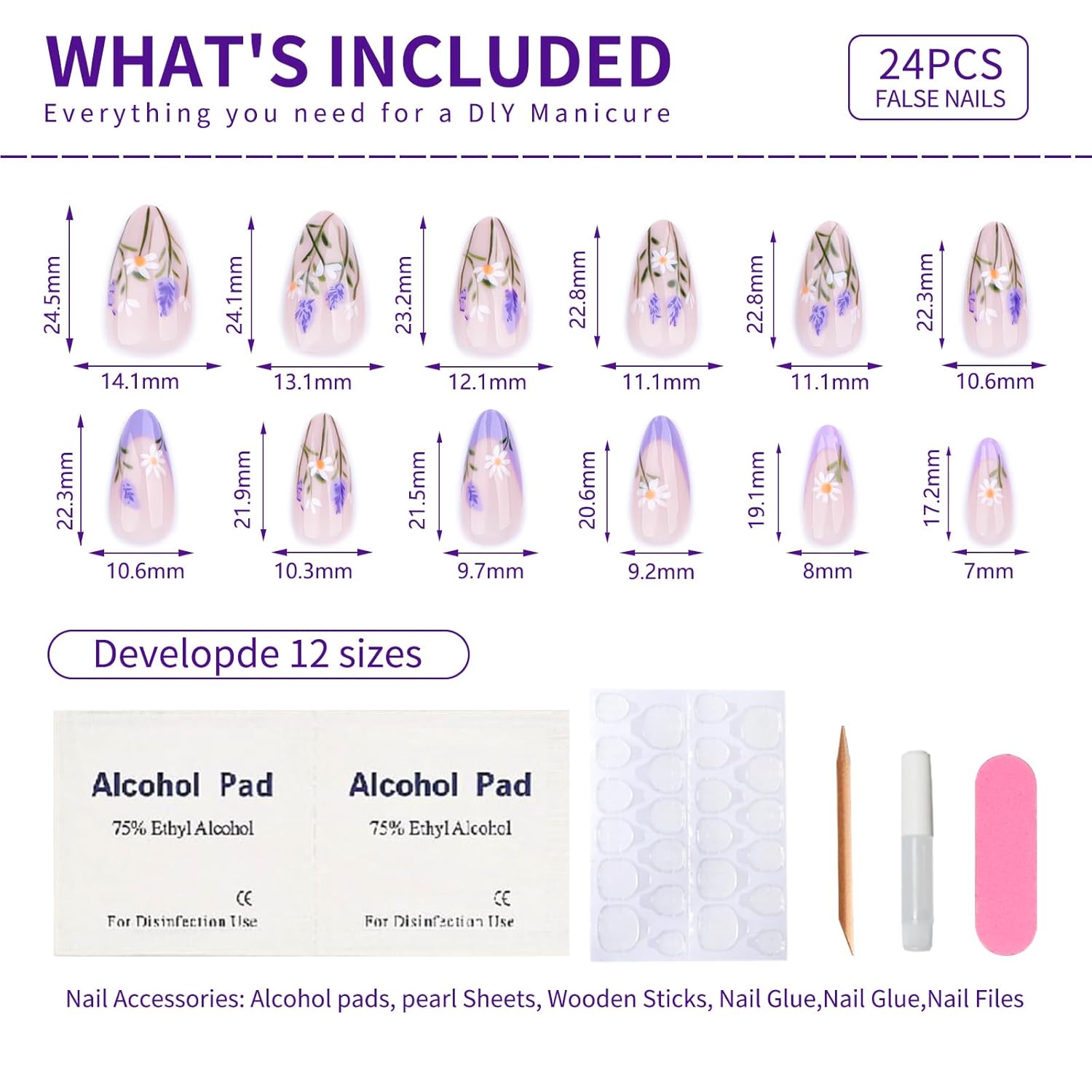 - Package Includes: 24 pcs stick on false glue on nails kit, each box includes 24 short press on nails, 1 sheet of 24 sticky nail pieces, 1 cuticle stick, 1 double sided nail file and gel press on nails cleaning pads, a small tube of nail glue,All the tools you need to apply the nails are included in one set