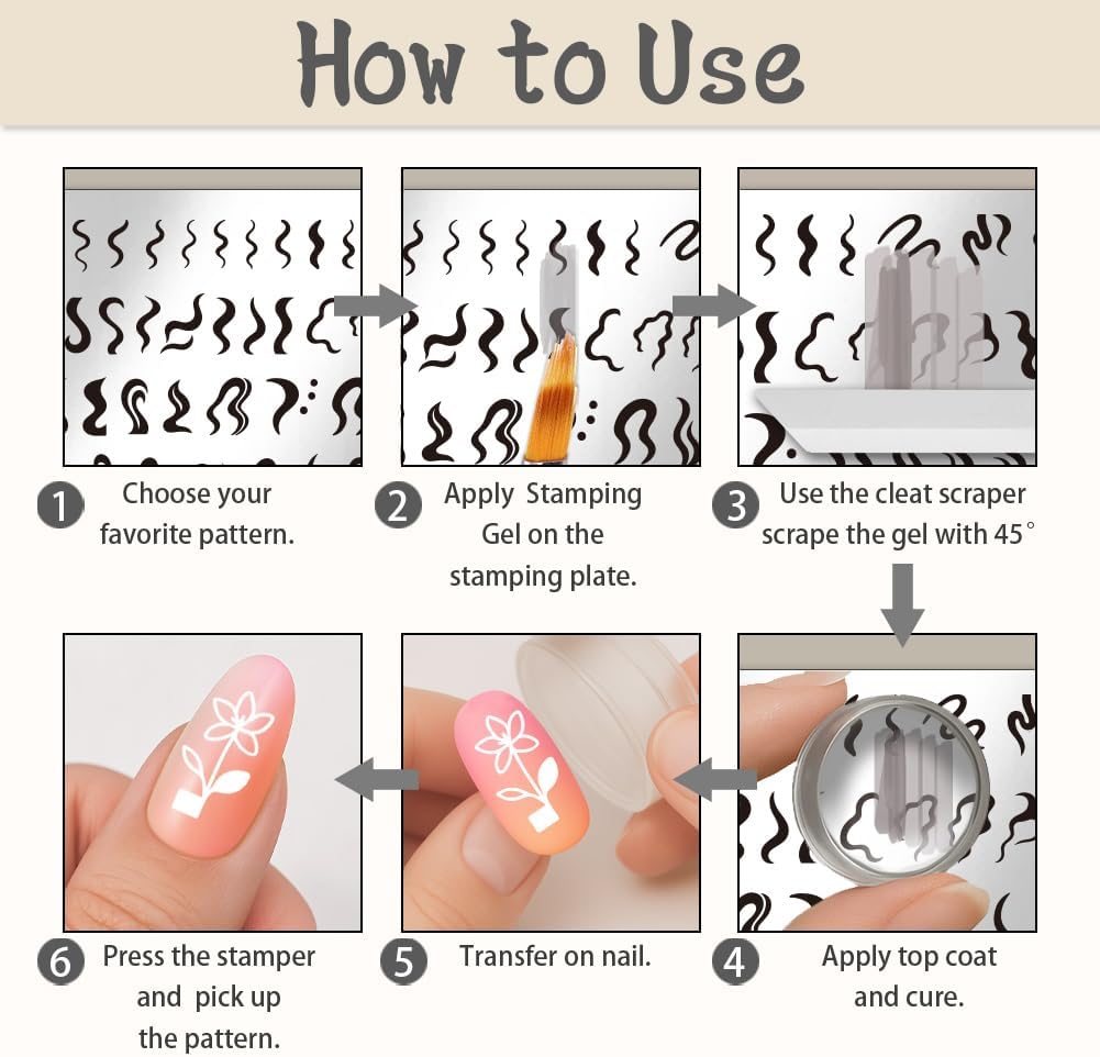- Easy to Use: You need peel off the blue protective film before using, apply stamping gel or polishes on the pattern, and scrape off the excess with the scraper, then use the stamper to pick up and move the image quickly, to finally press the stamp on the nail to get the nail pattern that you want.
