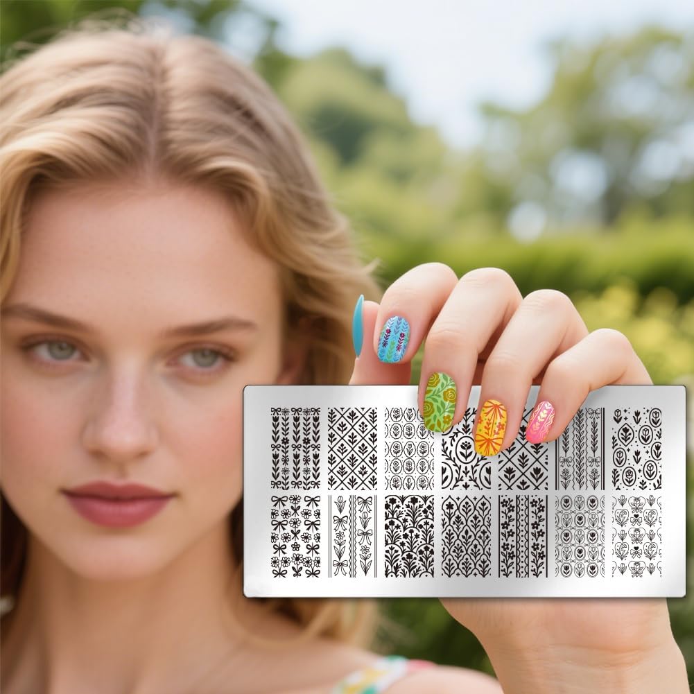 UNICRAFTALE 3Pcs Flowers Nail Plates Stamping Set Spring Bows Plants Stamp Nail Templates Reusable Stencils Stainless Steel DIY Nail Art Plates Nail Stamp Templates Kit DIY Printing Tools