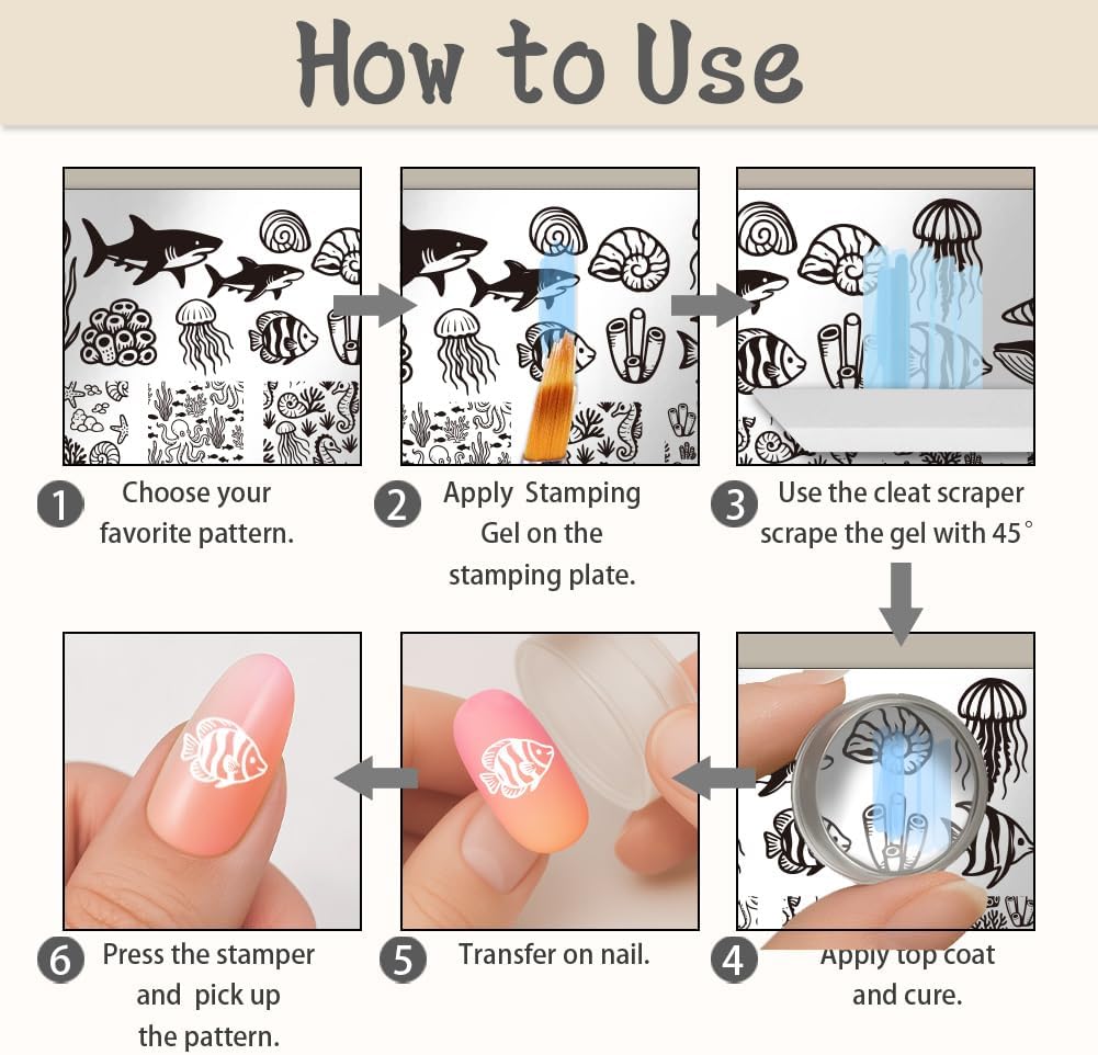 - Various Nail Stamp Plates:nail stamp plates are designed with a variety of ocean animal and platns, 12cm in length and 6cm in width, which can fully meet your different styles of nail art. You can easily enjoy your own nail art at home.