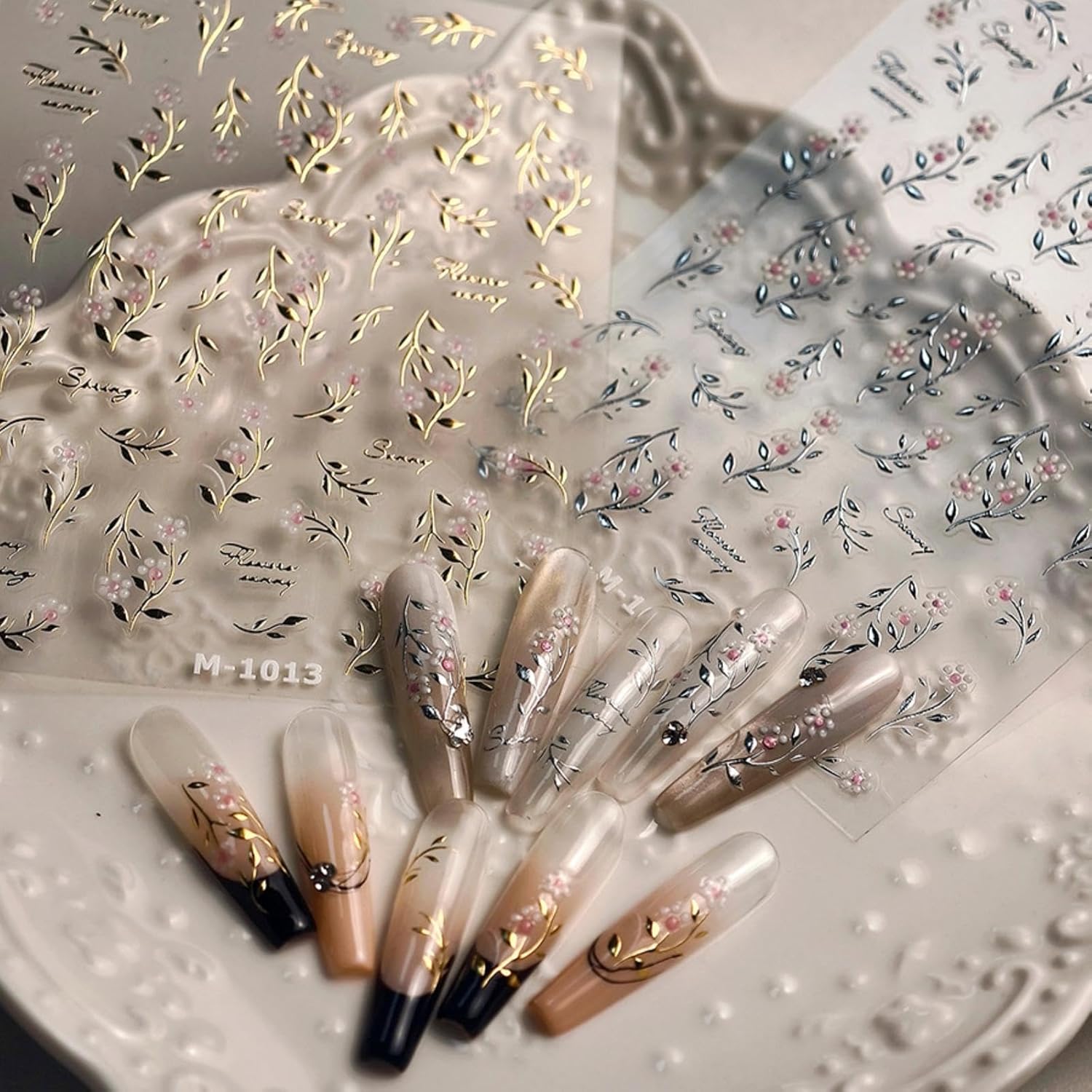 Leaf Flower Nail Stickers Gold Branch Nail Designs 3D Self-Adhesive Silver Leaf Nails Supplies 5D Embossed White Pink Fall Nail Decals Summer Nail Art Decoration for Women DIY Manicure 2 Sheets