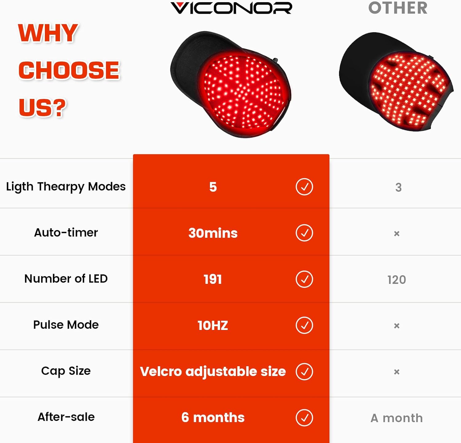 - Versatile Powering Options: For your convenience, the therapy cap can be powered directly by a wall adapter or by a Viconor power bank (not included), although direct plug-in is recommended for the most stable and effective performance.