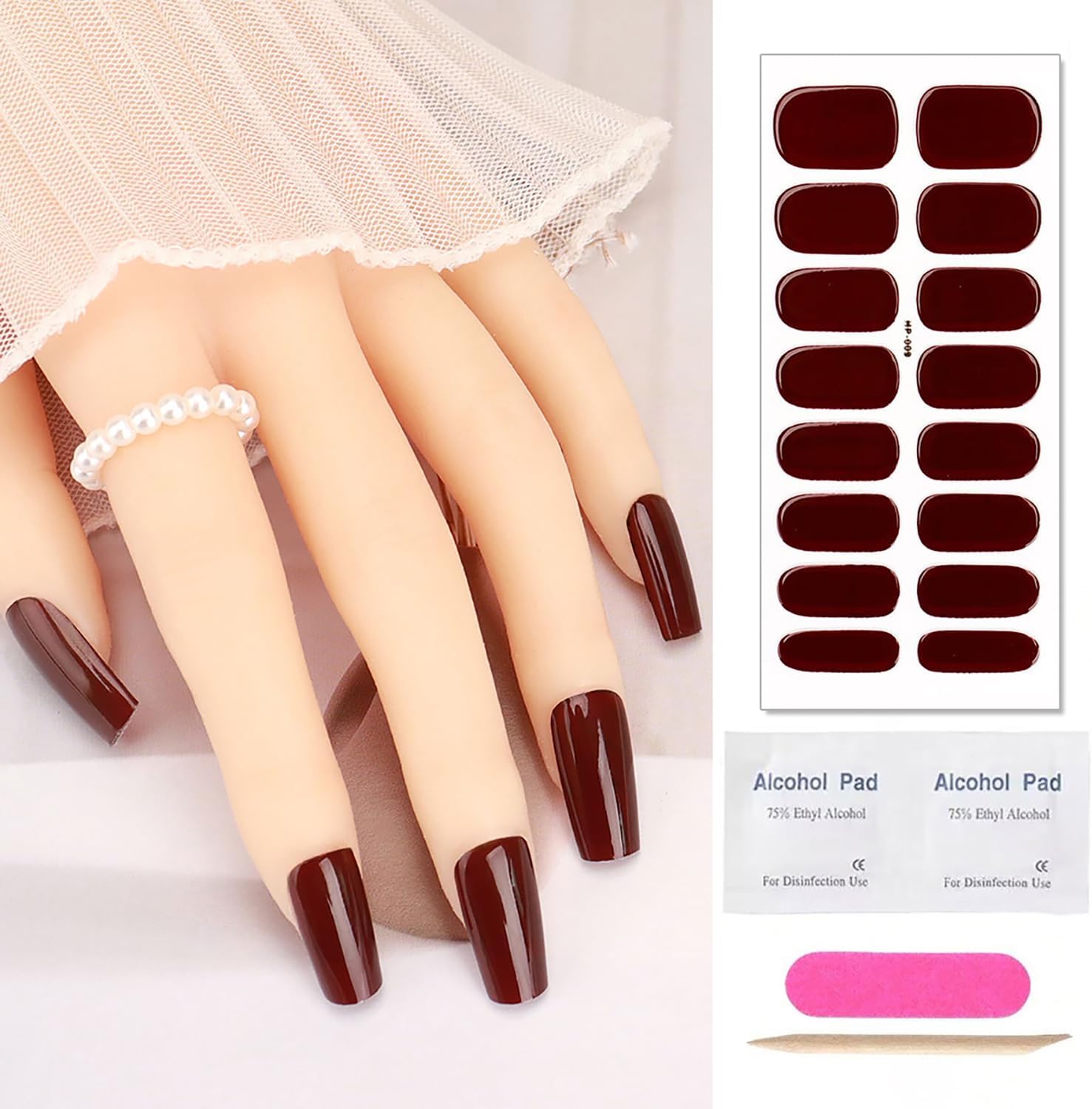 - Semi Cured Gel Nail Strips Set: Each box comes with 1 sheets reddish brown gel nail strips in 8 different sizes for the perfect match. It also comes with 2 prep pads, 1 nail file, and 1 wooden stick