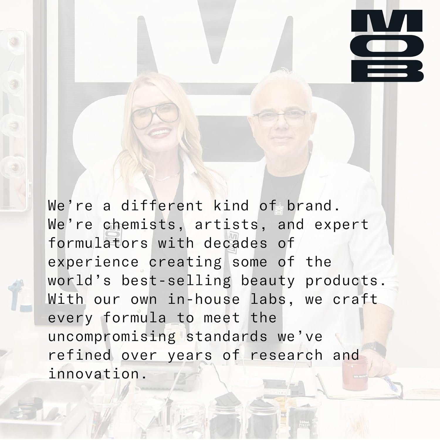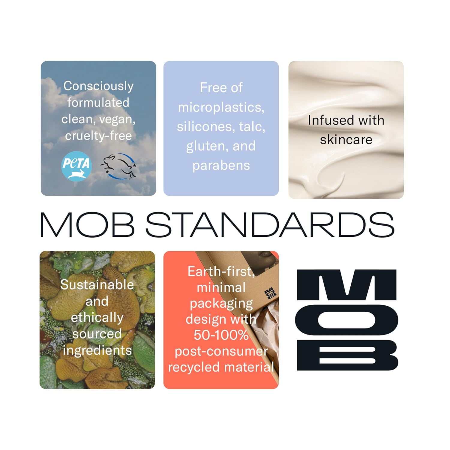 - Consciously Formulated Clean, Cruelty-Free, & Vegan – At MOB, we formulate with an extensive "free from" list including parabens, petroleum based ingredients, silicones, gluten, talc, & microplastics All our ingredients are ethically and sustainably sourced and certified PETA Vegan and Leaping Bunny Cruelty-free, never containing animal ingredients such as beeswax or carmine