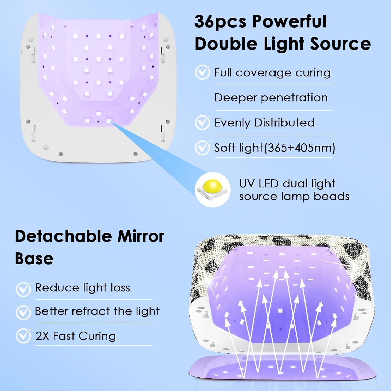 - 𝐅𝐚𝐬𝐭 𝐃𝐫𝐲𝐢𝐧𝐠 𝐆𝐞𝐥 𝐍𝐚𝐢𝐥 𝐏𝐨𝐥𝐢𝐬𝐡: The 80W nail dryer features 36 dual-light source beads, UV light shines from all directions and the removable reflective mirror base to better reflect the light for fast drying of gel nail polish. The light is soft (365 nm + 405 nm), gentle on the eyes and prevents hand darkening. It is ideal for DIY nail enthusiasts and salon level manicurists.