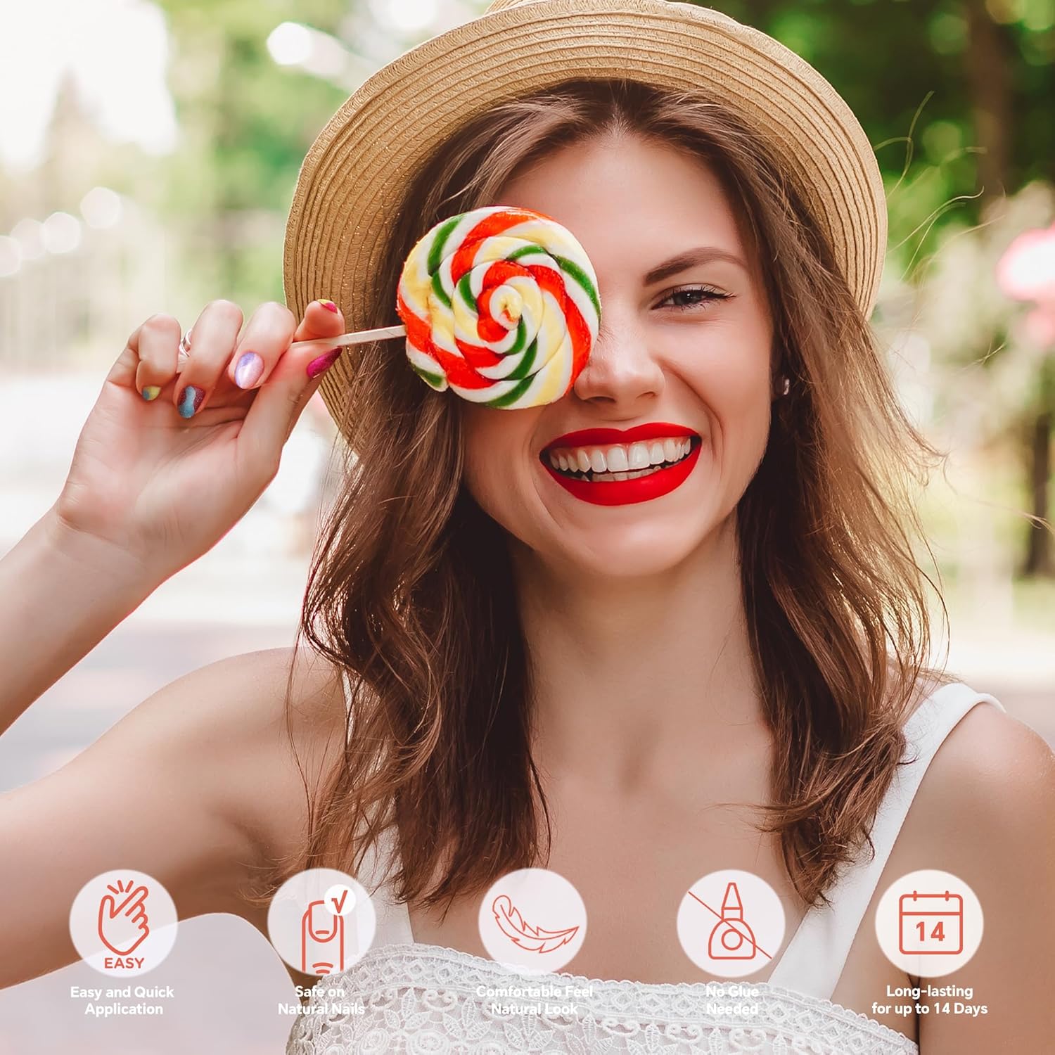 - 🌞【Salon-Polish Nails in 5 Min | 60s Set, Zero Mess! 】Slap on mirror-shine nails faster than your coffee brews. Peel → Press → Set → Go! Skip salon waits and harsh removers. Wake up glam or refresh mid-lunch break. Zero skills. Zero stress.