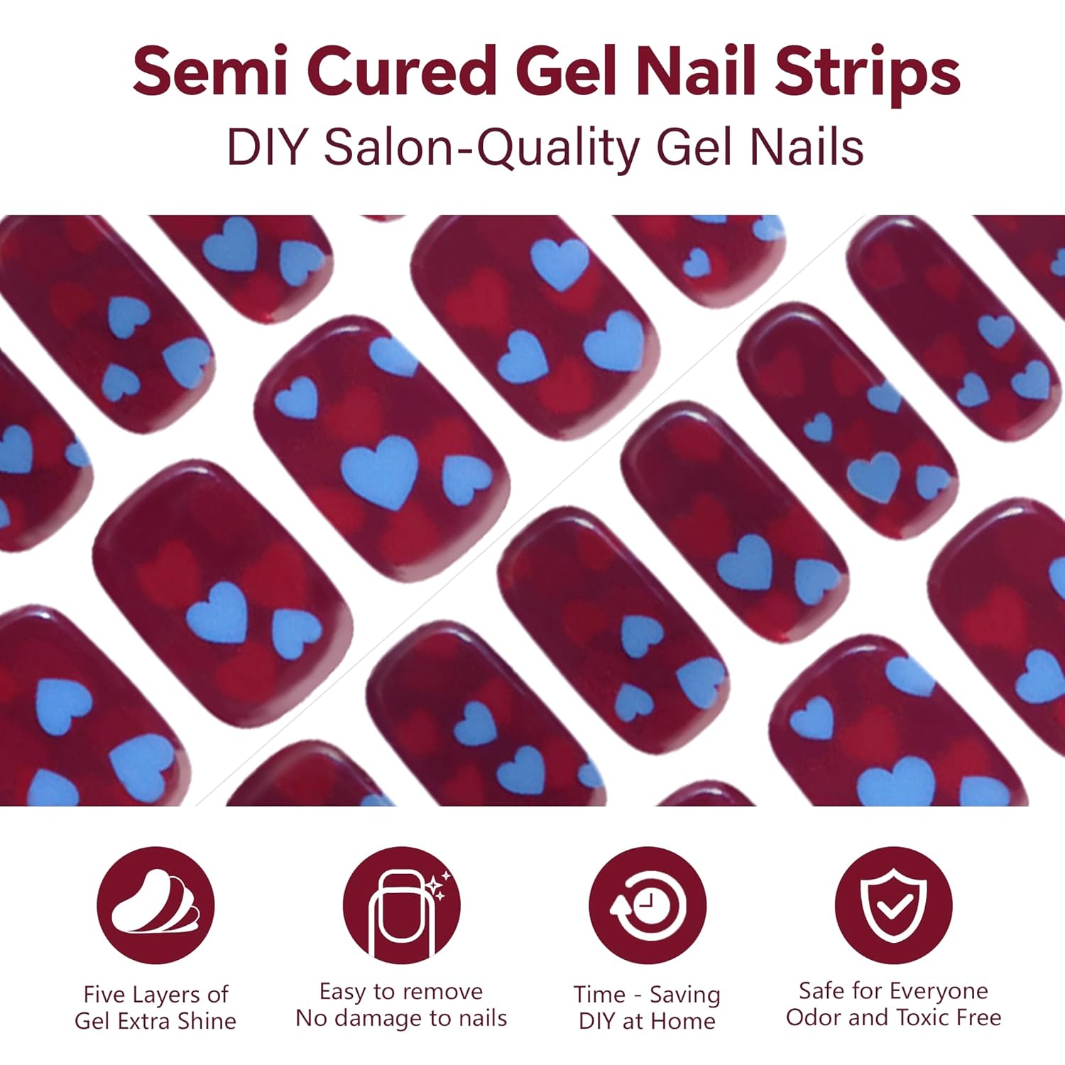 Semi Cured Gel Nail Strips-Salon Quality Semi-Cured Gel Press On Nails Stickers Quick DIY Nail Art Manicure Kits for Women at Home Works with Any UV/LED Lamps(Love Bomb)