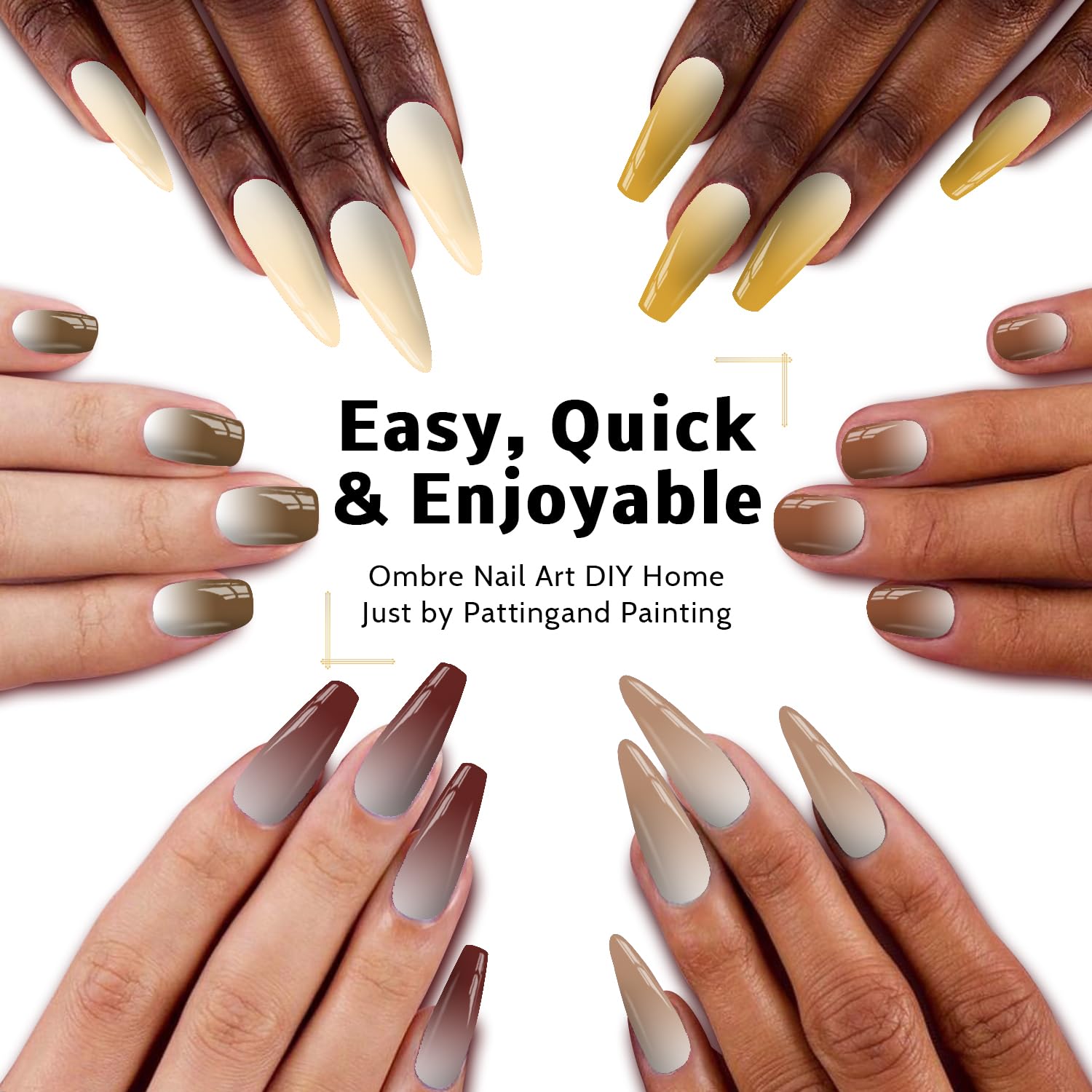 - 【HAVE FUN:】Karroy ombre nail gel will bring you great fun by self-coloring mixing, sponge-patting painting, brushes drawing & dotting, ect. It's easy, colorful, and wonderful! Package list: 9-Color Palette, 6PCS Nail Art Brushes, 1 Grabber, 100PCS Nail Sponges.