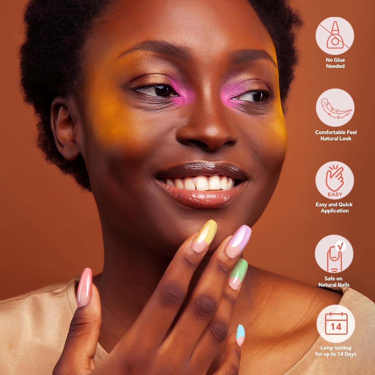 - 🌞【Salon-Polish Nails in 5 Min | 60s Set, Zero Mess! 】Slap on mirror-shine nails faster than your coffee brews. Peel → Press → Set → Go! Skip salon waits and harsh removers. Wake up glam or refresh mid-lunch break. Zero skills. Zero stress.