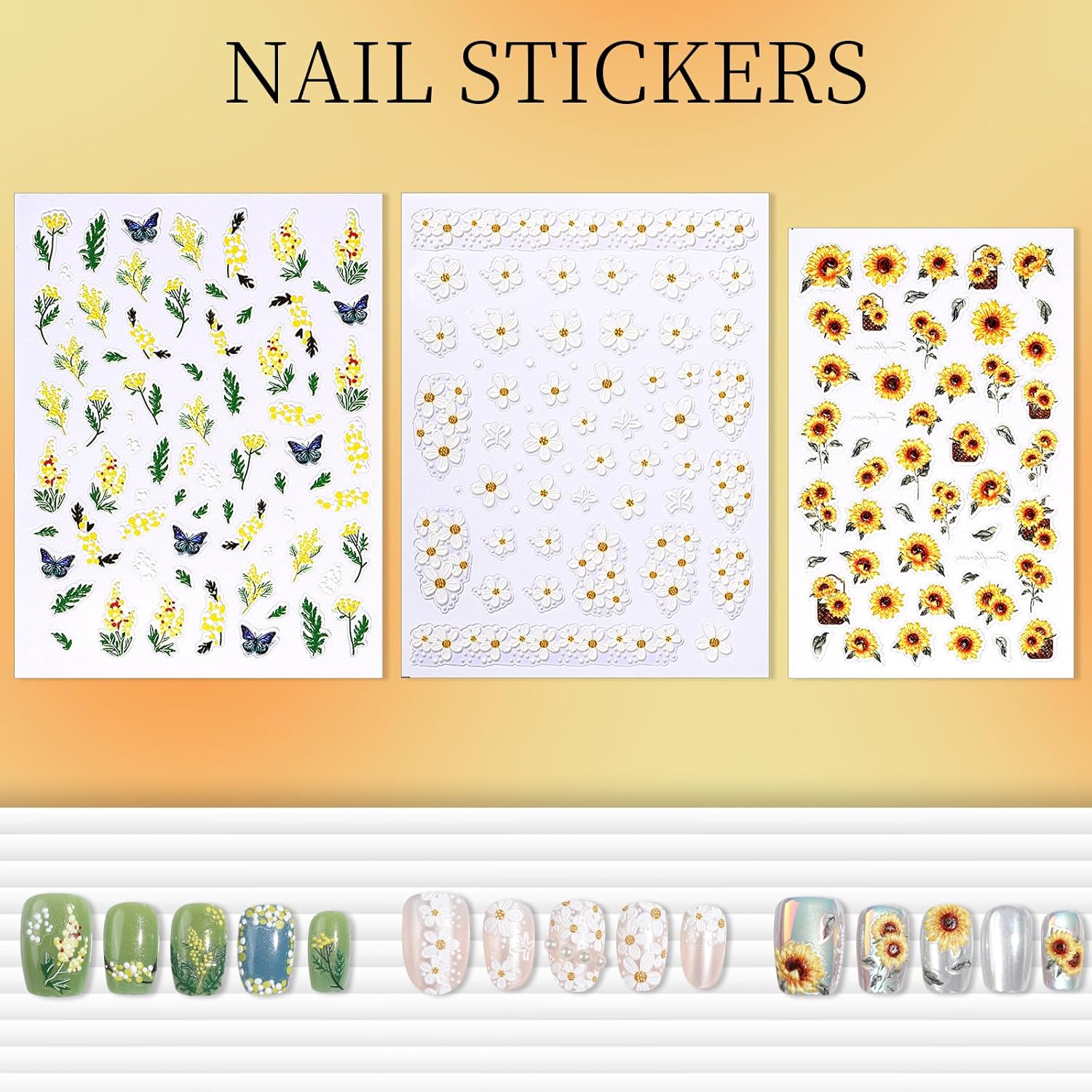 - Vibrant Nail Stickers Kit For Nail Design: What you will get: 7 x 5D embossed flower nail stickers, 1 x white gem stickers, 1 x mixed color gem stickers, 1 x pearl stickers, 1 x tweezers. As a common nail decorations for nail art, you could design your nail work with these cute nail stickers!