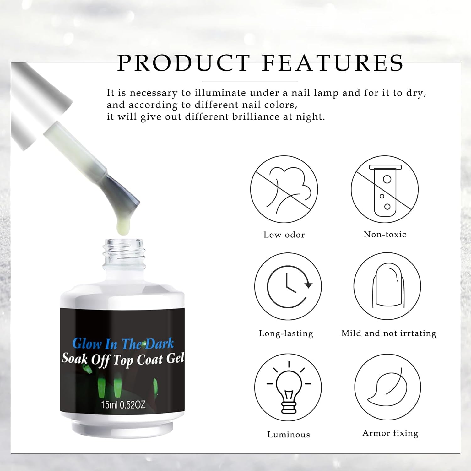 - 【Warm Tips】The glow in the dark top coat is not a completely transparent color, but will have a little green color. This is normal, and there is no need to worry about the nail polish itself. Glow in the Dark Gel Top Coat.