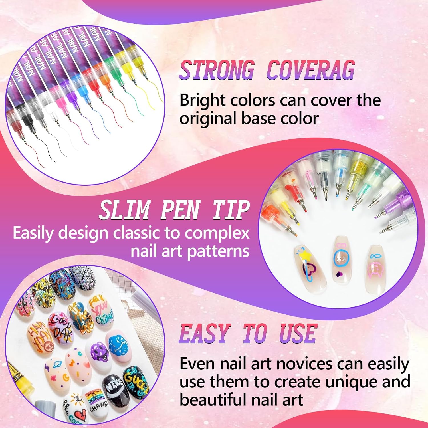 12 Colors Nail Art Pens Set, 3D Quick-Dry 0.5MM Nail Polish Pens, 2025 DIY Nail Art Marker Graffiti Dotting Pen for Nails Art Design Manicure Nail DIY Decoration
