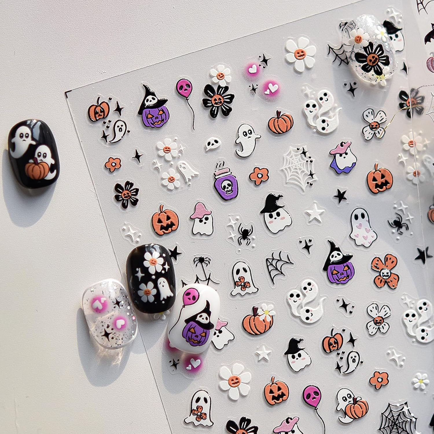 - Great Gift: Halloween nail decal is the best gift for mom, wife, and female friends. Cute ghost pumpkin flower nail decals are perfect for decorating finger nails and toenails. Suitable for decorating various artificial nails, including gel nail, acrylic nail, natural nail, false nail, nail tip and more