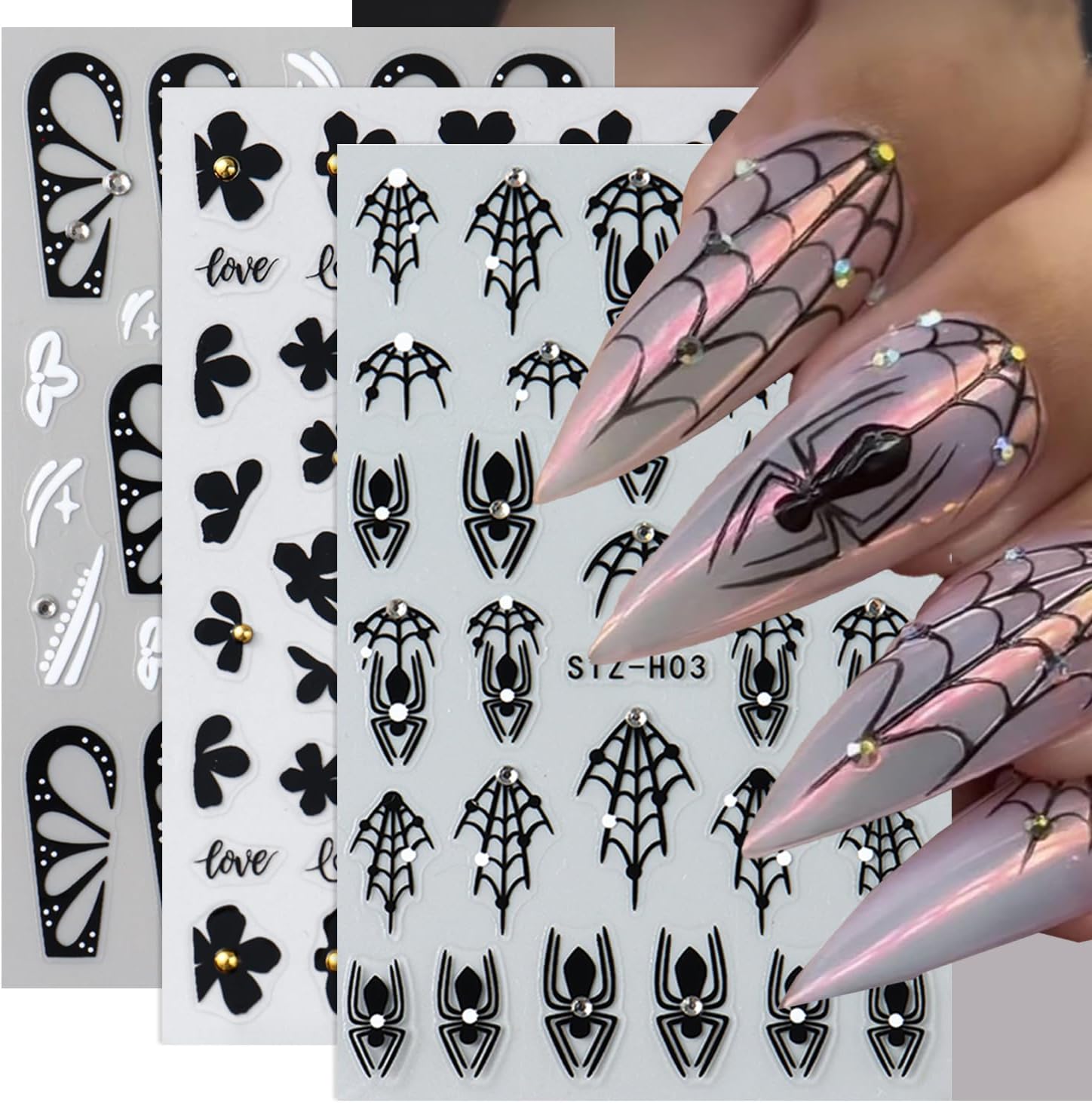 Halloween Nail Stickers Black Nail Decals Spider Web Nail Art Stickers Spider Flower Butterfly with Design Scared Nail Sticker for Nail Art Decor Holiday Manicure Supplies for Women 3Sheets