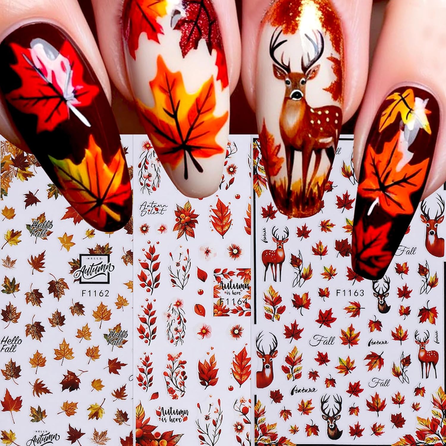 Fall Nail Stickers Maple Leaf Nail Decals 6PCS 3D Self-Adhesive Leaves Deer Nail Designs Stickers Autumn Nail Art Supplies Slider Fall Decorations for Nail Art Women DIY Manicure Accessories