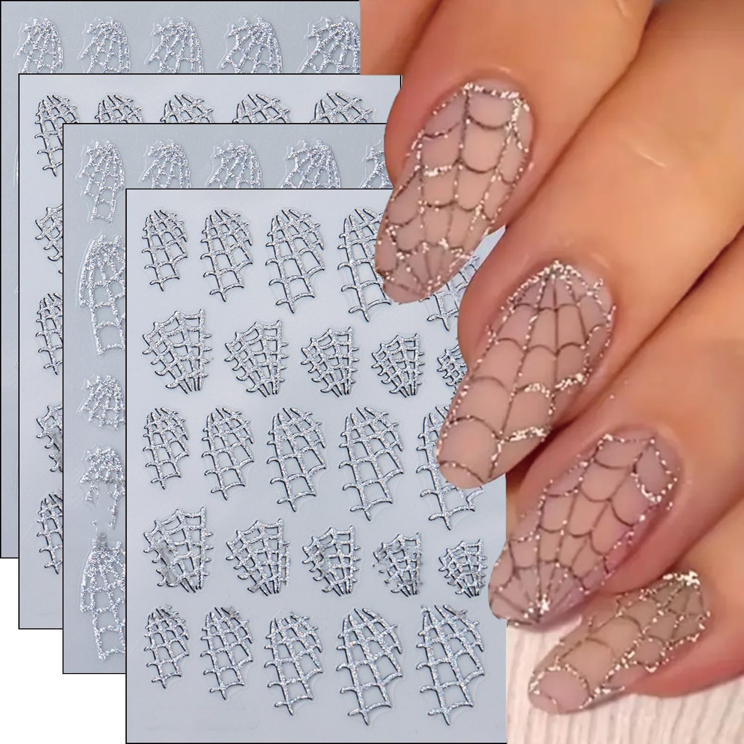 Halloween Nails Stickers Silver Glitter Web Nails Sticker 3D Embossed Glitter Web Self Adhesive Sticker Nail Decals Silver Webs Nail Art Decal Halloween Decals for Nail DIY Manicure 4Sheet